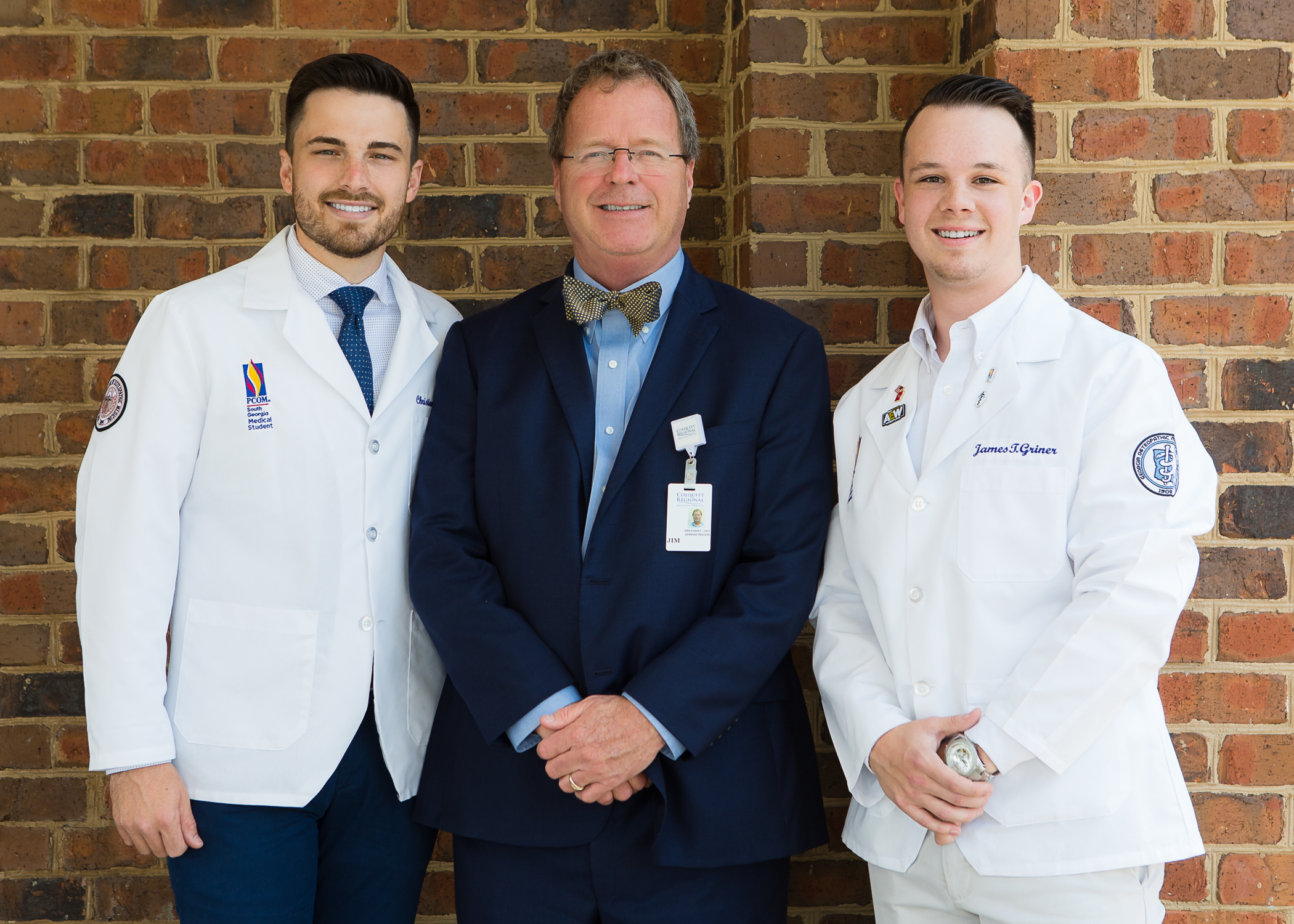 Photo 2 – Pictured are the 2021 Hospital Authority Trustee PCOM South Georgia Scholarship recipients, Christian Edwards, left, and Trent Griner, right, with Colquitt Regional President and CEO Jim Matney, center.