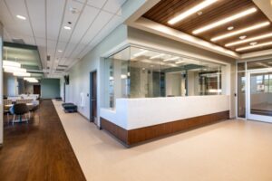 The building’s first floor includes a 300-person classroom, 18-seat computer lab, study area, skills lab, and four simulation labs with lifelike mannequins that are controlled to mimic realistic situations. The second floor is a full-service clinic with a behavioral health component, and the facility includes a small commercial kitchen to be used for community events — making it very versatile.