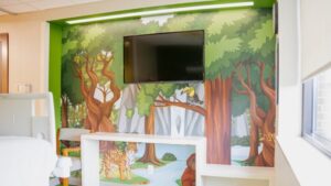 Each of the six patient rooms has been designed with a unique theme to create a comfortable and engaging environment for children. The themes include a space adventure, a coral reef, a jungle, a backyard farm, a land of dinosaurs, and a hot air balloon flight. These themes help to create a fun and interactive space for children to explore while they receive the care they need.
